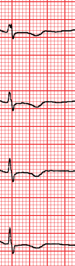 L’hypertension pulmonaire est importante (70 mmHg) dans ce cas. Ce tracé illustre bien que même avec une telle hypertension les modifications sur l'ECG peuvent être mineures, puisque seule la déviation axiale du QRS et des ondes T négatives de V1 à V6 (signe d'une surcharge ventriculaire droite), permettent de suspecter le diagnostic de surcharge ventriculaire droite avec ses répercussions sur l'oreillette droite.